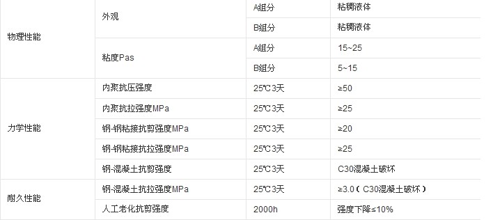 結(jié)構(gòu)膠指強(qiáng)度高(壓縮強(qiáng)度>65MPa,鋼-鋼正拉粘接強(qiáng)度>30MPa,抗剪強(qiáng)度>18MPa),能承受較大荷載,且耐老化、耐疲勞、耐腐蝕,在預(yù)期壽命內(nèi)性能穩(wěn)定,適用于承受強(qiáng)力的結(jié)構(gòu)件粘接。
