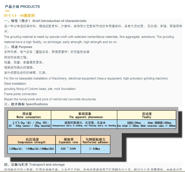 The grouting material is made by special craft with selected cementitious materials, fine aggregate, admixture, The grouting material have a high fluidity, no shrinkage, early strength, high strength and so on.