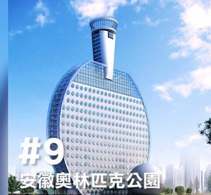 9、安徽奧林匹克公園。郝毅博不懂為什么運動公園要做成酒瓶?如果賣酒公司做成這個造型還可以理解,但網友說,這其實是乒乓球拍啦!