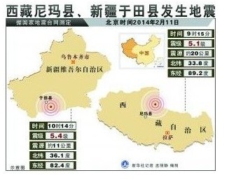 微博益起來 #微公益資訊#【新疆于田縣5.4級地震、西藏尼瑪縣5.1級地震】據正式測定:2月11日10時14分在新疆和田地區于田縣發生5.4級地震,震源深度11千米。9時15分在西藏那曲地區尼瑪縣發生5.1級地震,震源深度20千米。愿和田加油,愿尼瑪挺住!轉發祈福! [查看圖片]