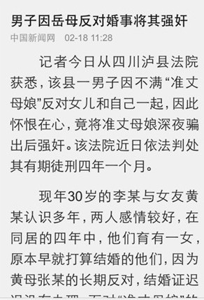 56網 【男子不滿準岳母反對女兒婚事 深夜將其騙出強奸】李某與女友黃某已經同居四年,并育有一女,但因為黃母的長期反對,遲遲沒有領結婚證,因此懷恨在心。某日深夜李某以外出幫忙搬輪胎為由,將黃母騙到鄉下一間舊廠房內后強奸,法院近日依法判處李某有期徒刑四年一個月。(轉自網絡) [查看圖片]