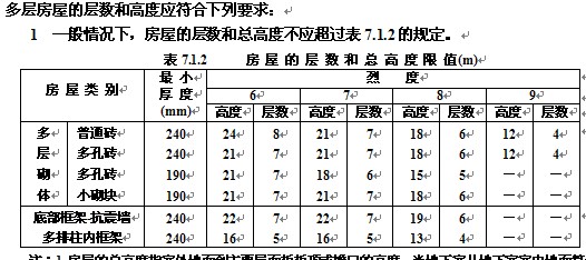 對醫院、教學樓等橫墻較少的多層砌體房屋,總高度應比表7.1.2的規定降低3m,層數相應減少一層;各層橫墻很少的多層砌體房屋,還應再減少一層。橫墻較少指同一樓層內開間大于4.20m的房間占該層總面積的40%以上。橫墻較少的多層磚砌體住宅樓,當按規定采取加強措施并滿足抗震承載力要求時,其高度和層數應允許仍按表7.1.2的規定采用。普通磚、多孔磚和小砌塊砌體承重房屋的層高,不應超過3.6m;底部框架-抗震墻房屋的底部和內框架房屋的層高,不應超過4.5m。多層砌體房屋的結構體系,應符合以下7個要求: