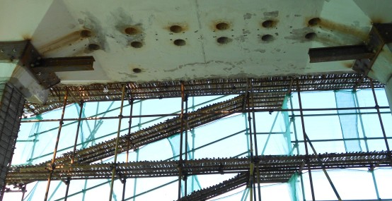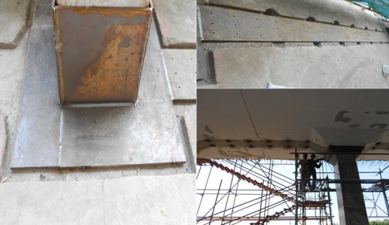 壓型鋼板與混凝土梁接觸處有縫隙:改良混凝土澆筑方法,減少接縫處下的掛漿,先在接縫處用坍落度較小的混凝土填實。