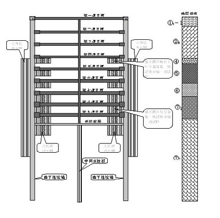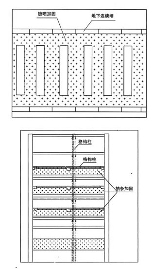 在澆素混凝土和結(jié)構(gòu)制作前,為起到預(yù)先支撐作用,在每道混凝土撐下均進(jìn)行施噴抽條加固。被動(dòng)區(qū)加固對(duì)變形的控制效果是非常顯著的。裙邊加固寬度和裙邊加固深度都存在一個(gè)有效范圍,當(dāng)超出該有效范圍后,加固效果的提高幅度不顯著。在抽 條加固置換率保持一定的情況下,抽條加固的布置 形式對(duì)基坑變形的影響較小。當(dāng)裙邊加固參數(shù)不變 時(shí),被動(dòng)區(qū)加固的作用效果主要與抽條加固的置換 率有關(guān),置換率越大,加固效果越好;在置換率一 定的情況下,加固效果與抽條加固體斷面形狀、抽 條的布置形式等基本無關(guān)。事實(shí)上,從宏觀上看, 抽條加固就相當(dāng)于一軸向受力的拉壓構(gòu)件,其受力 與變形之間的關(guān)系主要與受力面積(即抽條置換率) 相關(guān),而與斷面形狀、布置形式等關(guān)系不大。